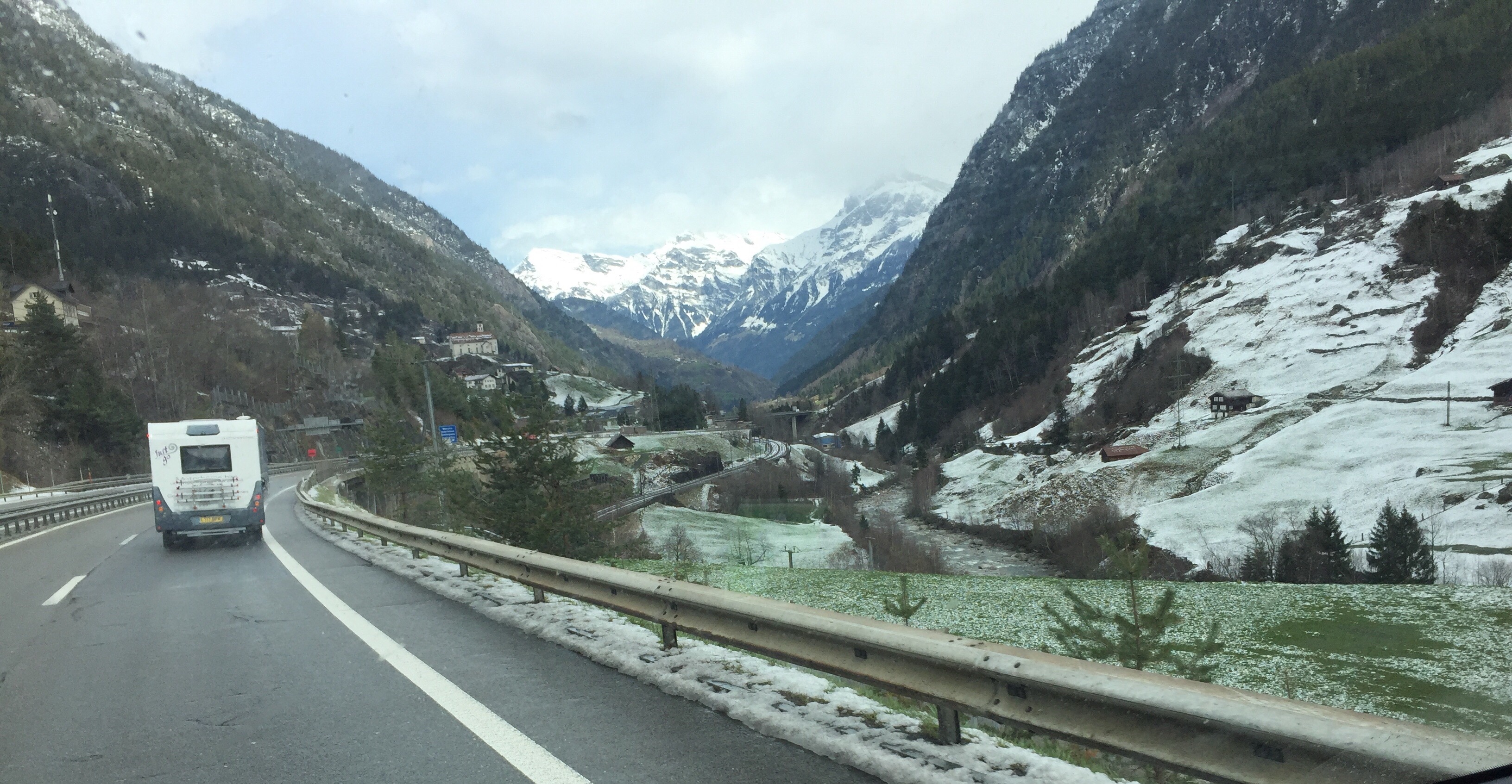 The weather was hideous until the 17km San Gottardo Tunnel (thank goodness the pass was closed otherwise John was tempted to give it a go). As we came out the other side, into snow, the weather changed and the sun came out.