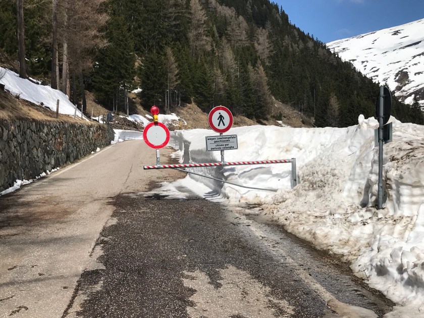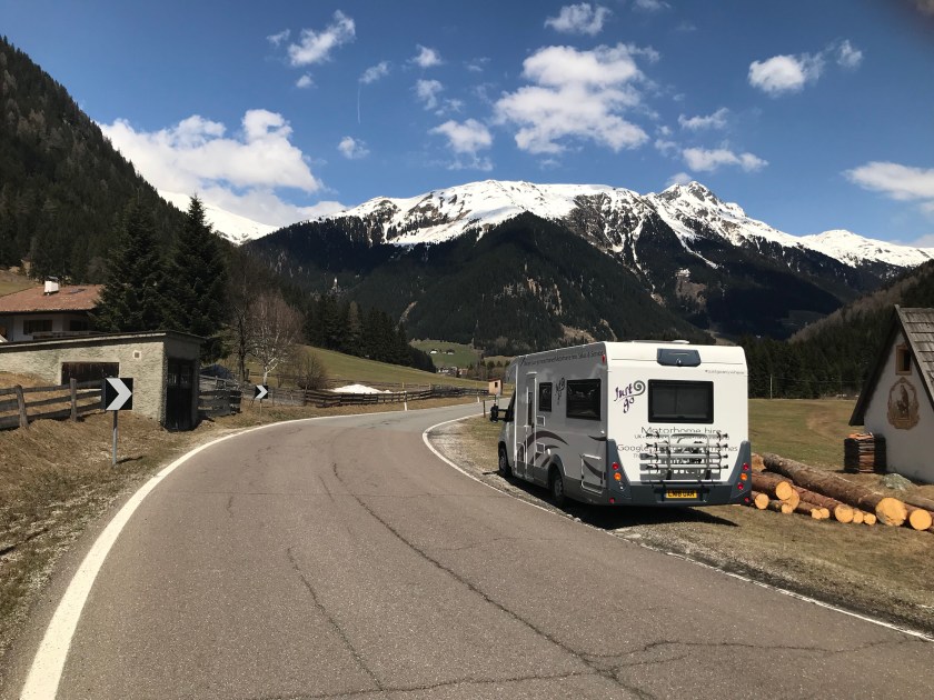 We headed for the motorway and were making good time when Kim’s phone gave us an option! We could take a route over the top of the Dolomites’, rather than around, and it would only take an extra 38 minutes. We checked it on Colin’s special motorhome satnav and a good old fashioned map. It was a ‘main road’, what could possibly go wrong?