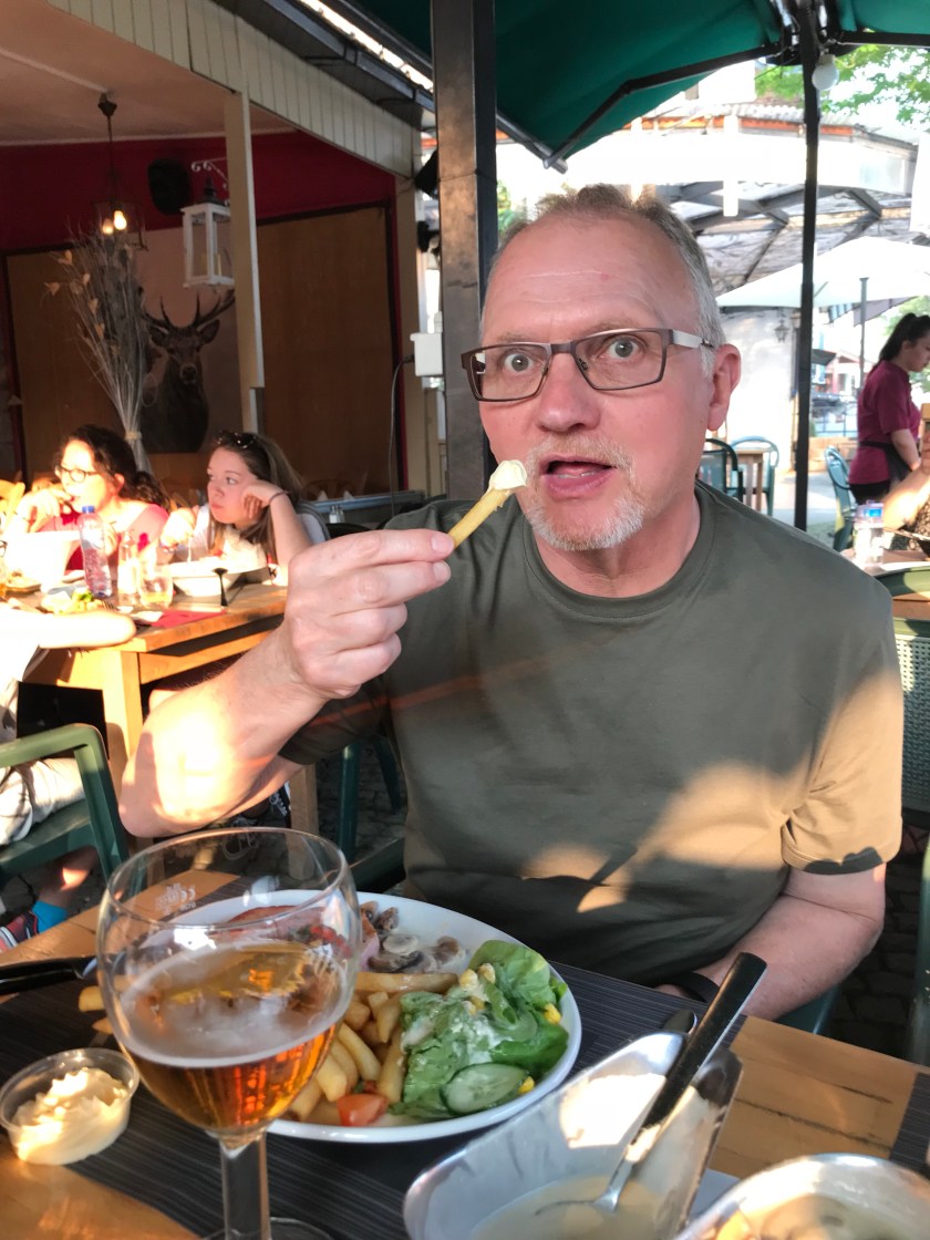 Ken and Kim were determined to sample the Belgian classic dish of Frites and mayonnaise, it was a short walk into town, which made a pleasant change. Most of our sites have been fairly isolated so a choice of restaurants made us feel very cosmopolitan!