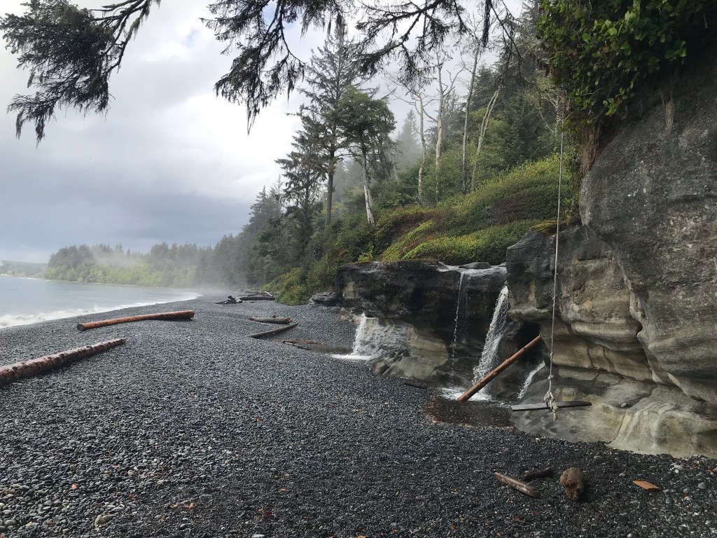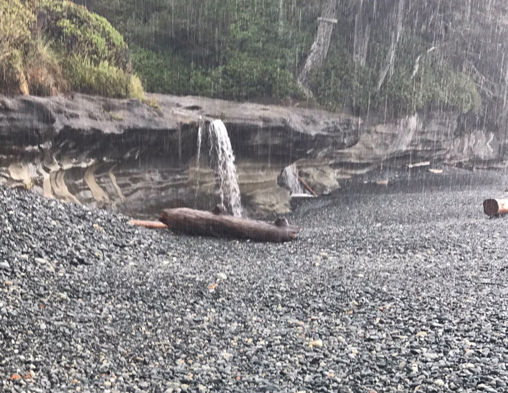 Our first stop was Sandcut beach and we were back in Old Growth Rainforest territory, in the pouring rain, scrambling over tree roots crossing the path.