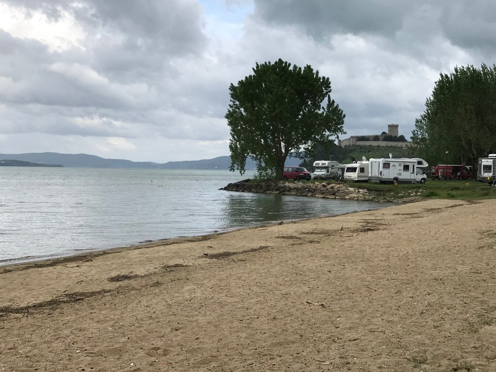 The site is rather muddy but the sky cleared and we had a lovely view over Lago Trasimeno.