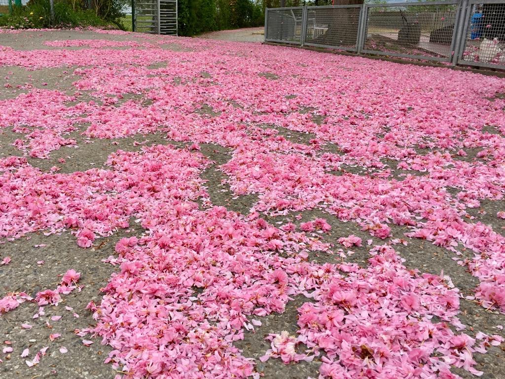 As we cycled back, the weather changed. Skies darkened, the calm lake became agitated and the wind became stronger. Beautiful Cherry blossom was blown from trees onto the ground creating pink paths.