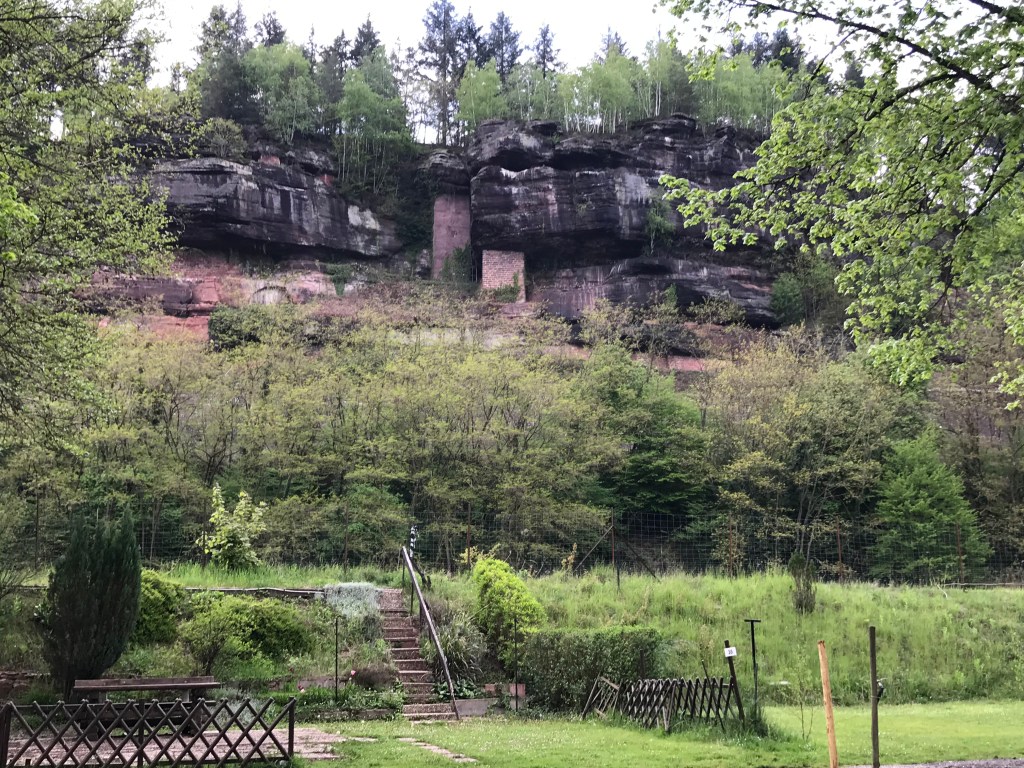 It’s easy to tell we’re in France, campsites are not a patch on those in Germany or Austria. We are sandwiched between a road, river, canal and railway. Facilities are very French and the cliff opposite is propped up with brick pillars.