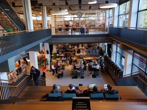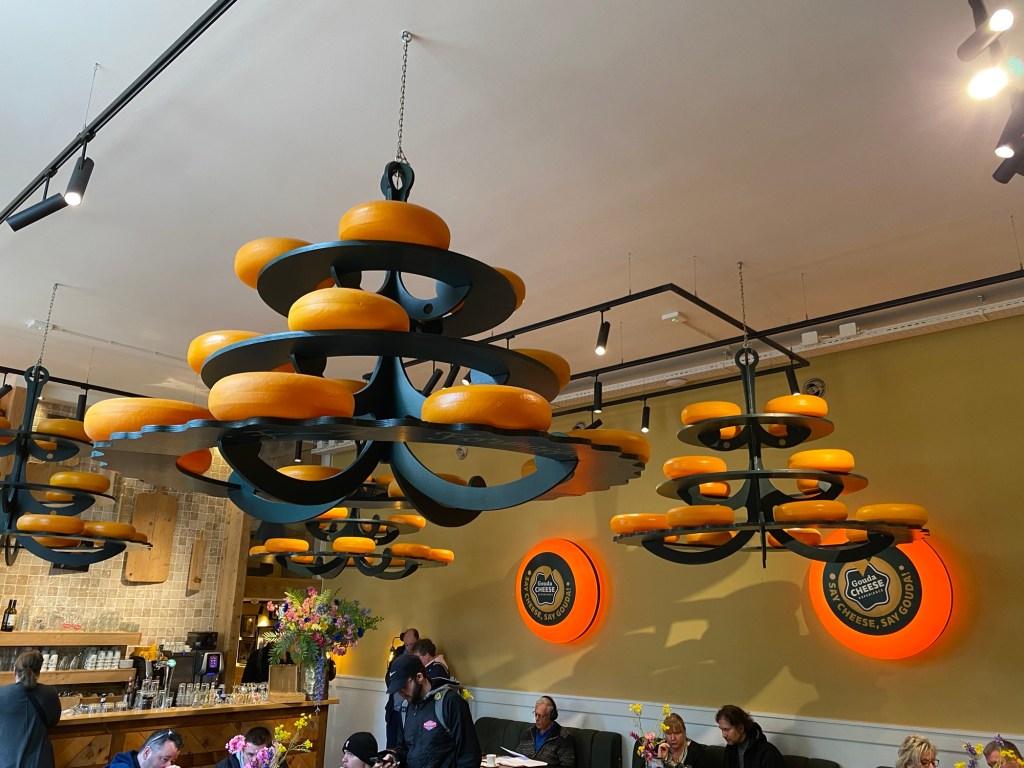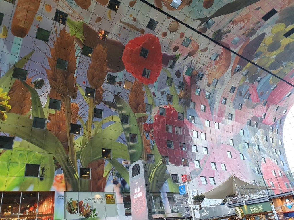Having decided a harbour tour would be too wet and cold, we took a break in the Markthall in Rotterdam. It was conveniently near to our station and it seemed rude not to explore what is essentially a multicultural food hall, spotlessly clean and full of tempting smells and free samples. We started to regret that we’d eaten lunch at the arboretum. There are no photos of the amazing interior, we were too busy going ‘oooh’. Luckily Jacky thought to take one of the ceiling