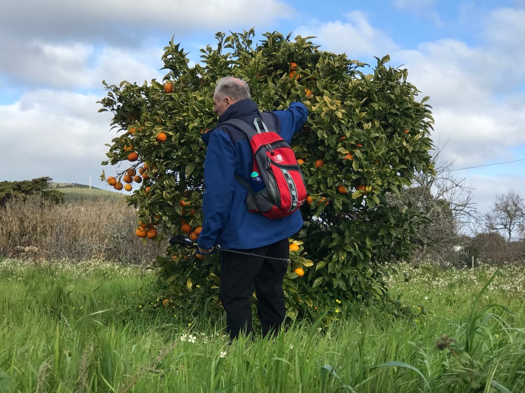 At Figueira, we walked past small farms and in, what looked like an abandoned field, John took the opportunity to scrump an orange.