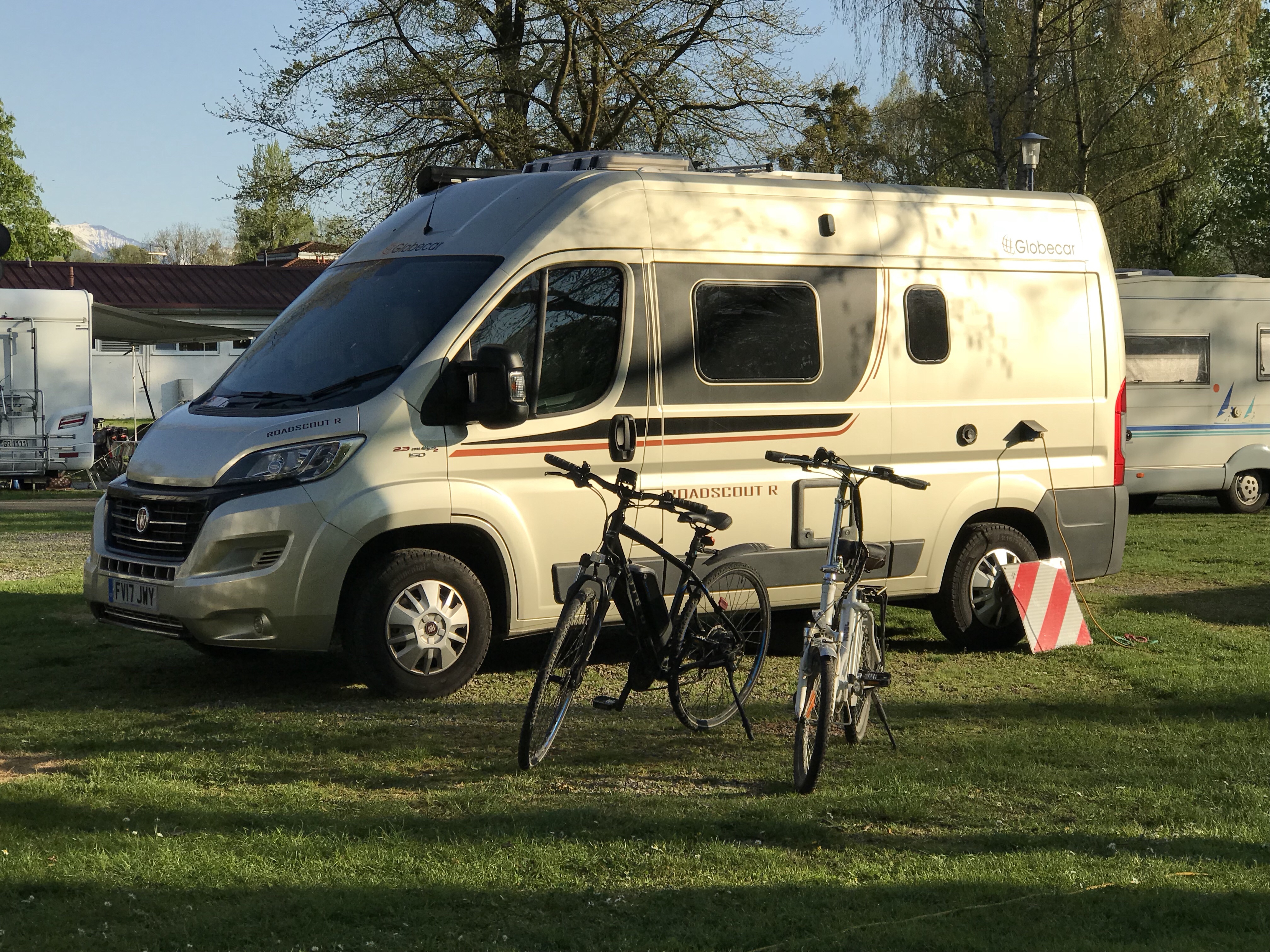As we left site today we noticed this German camper van demonstrating how it should be done, spotlessly clean with full-width awning and ground cover, bikes carefully positioned one side and a barbecue the other. They even have a beer crate for empty bottles.